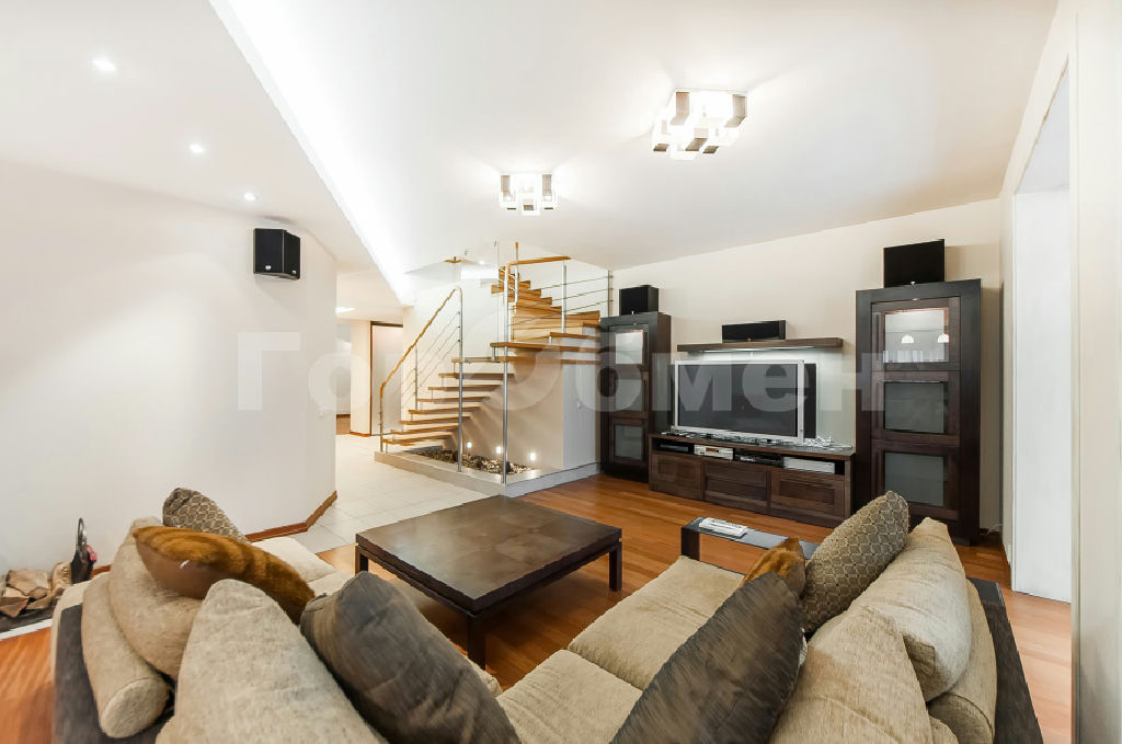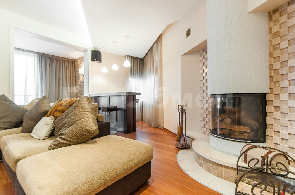 На 1-ом уровне размещена функциональная кухня площадью 17,9 кв.м, гостиная с панорамным остеклением, которое открывает красивый вид на Москву-Сити, каминный зал, гардеробная, санузел с душевой кабиной.